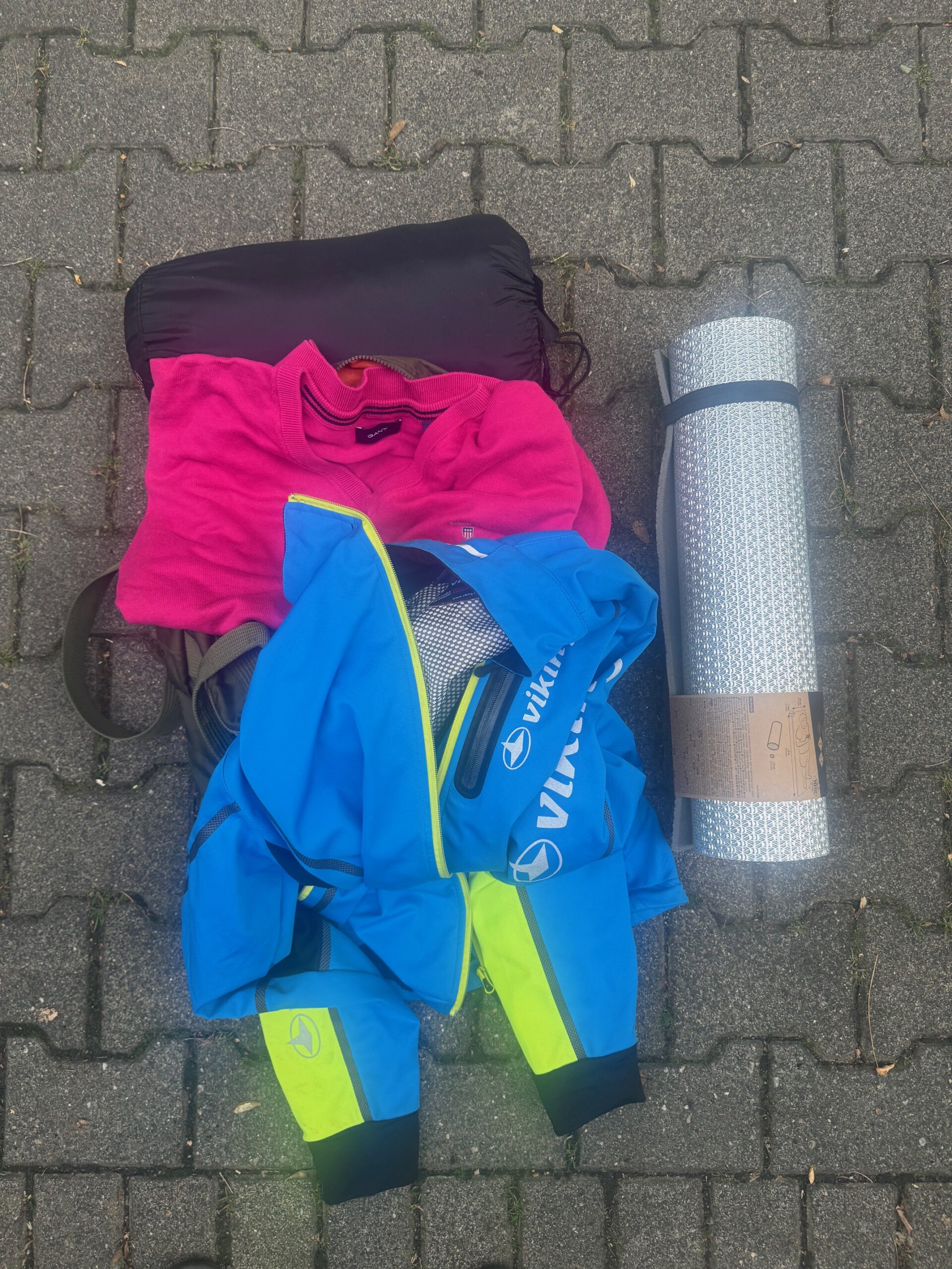 Wir haben einen Rucksack und eine thermomatte gekauft (wenn die Spenden zu gering sind selbstverständlich auch von eigenem Geld), einen Pullover und eine Regenjacke, inklusive Tasche.
